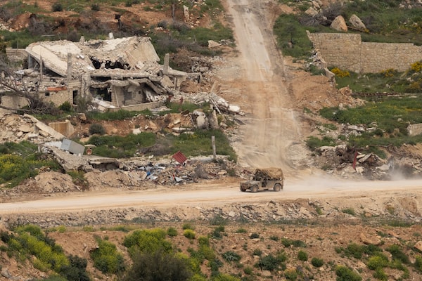 Israeli army vehicle moves near destroyed houses in Southern Lebanon, as seen from a position on the Israeli side of the border on Wednesday.Amir Levy/Getty Images