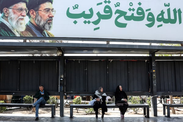 A banner featuring Iran's late supreme leader Ayatollah Ali Khamenei, left, and his son newly elected supreme leader Mojtaba Khamenei, in northern Tehran on Thursday.-/AFP/Getty Images