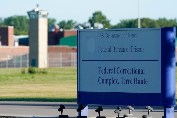 A sign stands outside the Federal Correctional Institution, Terre Haute, ahead of the planned federal execution of Daniel Lewis Lee on July 13, 2020.BRYAN WOOLSTON/Reuters