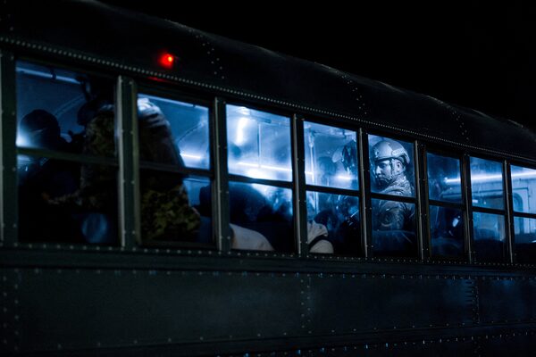Salvadoran police officers escort alleged members of the Venezuelan gang Tren de Aragua recently deported by the U.S. government to be imprisoned in the Terrorism Confinement Center prison in Tecoluca, El Salvador, in this handout image from March 16.Secretaria de Prensa de la Presi/Reuters
