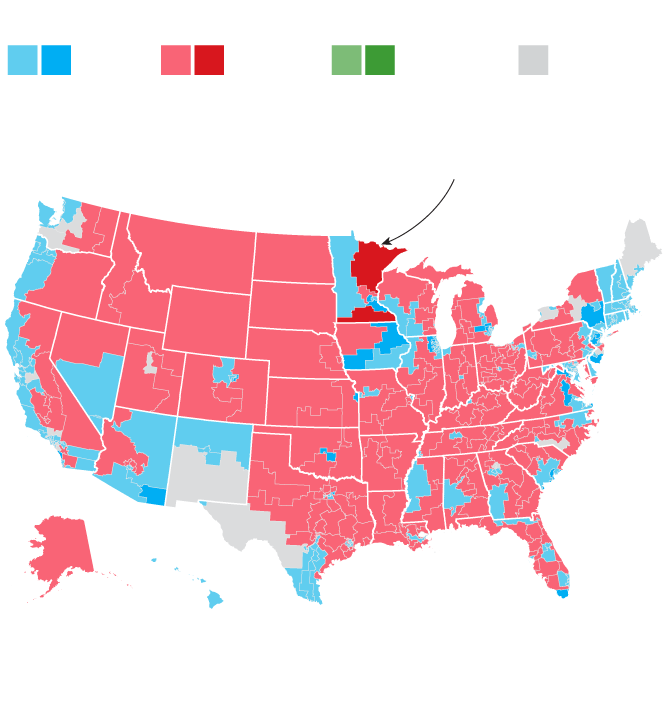 House: All 435 seats in the House of Representatives were up for grabs on Tuesday, with 218 needed to form majority. As of 7 a.m. (ET) Thursday, the Democrats were elected in 223 seats, a gain of 28 seats. Fifteen more seats were still undecided, with a narrow Democratic majority as the likely outcome. Though control of the House would be a significant win, the Republicans didn’t lose as many races as the president’s party usually does in midterms. (In contrast, Republicans gained 63 seats in 2010 when Democrat Barack Obama was president.)