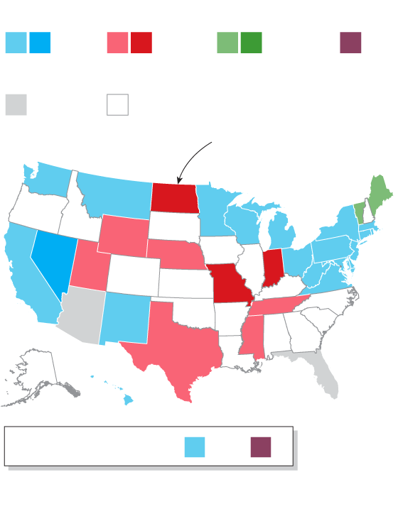 Senate: U.S. senators serve six-year terms, meaning only a third of them are up for grabs in either midterm or presidential election years. This year, the Republicans maintained a narrow advantage, capturing Senate seats in Indiana, Missouri and North Dakota. That’s a better-than-average performance; usually the president’s party loses Senate seats in midterms.