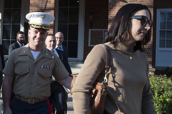 Marine Major Joshua Mast and his wife, Stephanie, walk out of Circuit Court, March 30, 2023, in Charlottesville, Va.Cliff Owen/The Associated Press