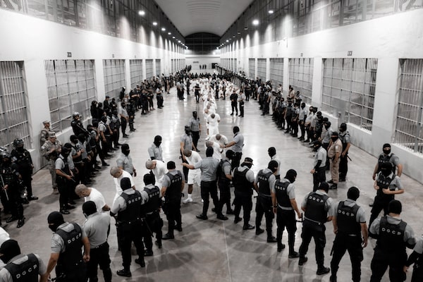 Salvadoran police officers escort alleged members of the Venezuelan gang Tren de Aragua recently deported by the U.S. government to be imprisoned in the Terrorism Confinement Center (CECOT) prison, as part of an agreement with the Salvadoran government.Secretaria de Prensa de la Presi/Reuters