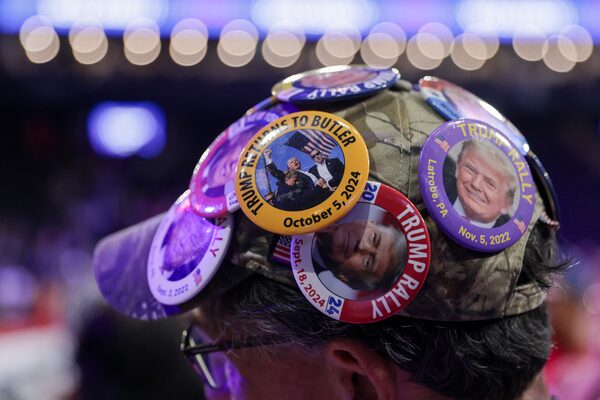 One of this Pennsylvania Trump supporter's buttons commemorates the candidate's return to Butler, Pa., months after the July rally where a would-be assassin with an AR-15 rifle grazed his ear. Republican and Democrat leaders alike denounced the attempted killing, calling for calm in a heated climate of U.S. politics.Jeenah Moon/Reuters