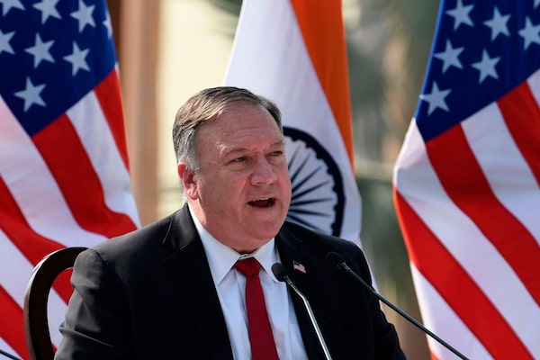 U.S. Secretary of State Mike Pompeo speaks during a joint news briefing at Hyderabad House, in New Delhi, India, on Oct. 27, 2020.MONEY SHARMA/AFP/Getty Images