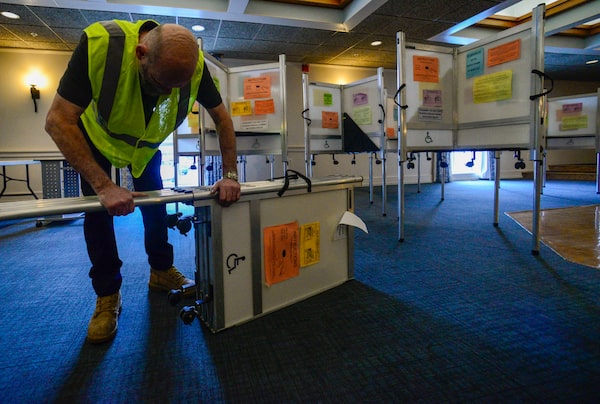 A maintenance worker for the Brattleboro, Vt., Department of Public Works helps assemble the voting booths as people turn a section of the American Legion lodge into the town's polling location on March 4, before Tuesday's election.Kristopher Radder/The Brattleboro Reformer via AP