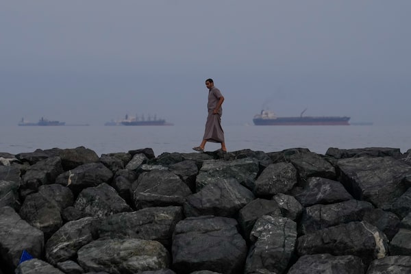 Oil tankers and cargo ships line up in the Strait of Hormuz, as seen from the United Arab Emirates on March 11. Oil and commodities markets are keen for signs traffic is resuming.Altaf Qadri/The Associated Press