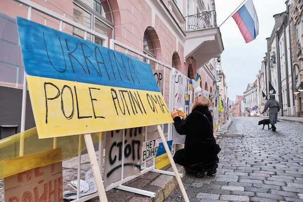 Laura Juristo makes some repairs to the display of Ukrainian flags and antiwar signs outside Russia's embassy in Tallinn, capital of Estonia.Photography by Hendrik Osula/The Globe and Mail
