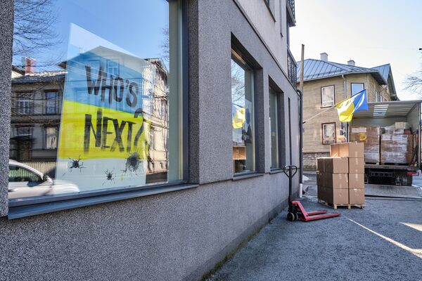'Who's next?' reads a sign in Tallinn near a collection of donated supplies for Ukrainians.