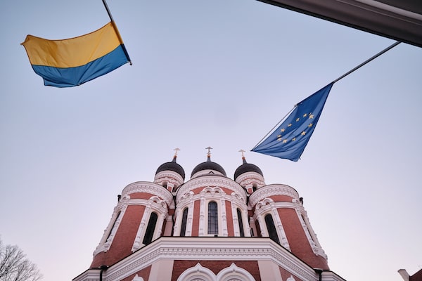 Out and about in Tallinn: At top, Ukrainian and EU flags fly at Alexander Nevsky Cathedral, named for a 13-century prince revered in Russia for repelling invaders; at bottom, patrons dine at Maiasmokk, a café across from the Russian embassy.