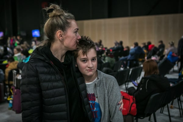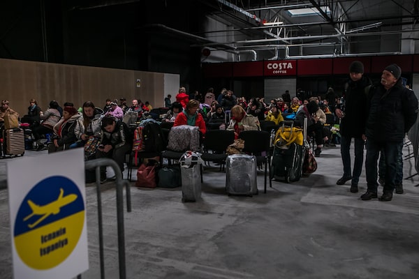 Ukrainian refugees wait for buses to Spain at the Ptak Warsaw Expo exhibition centre, a trade show hall that has been set up as a temporary shelter for up to 20,000 people.Anna Liminowicz/The Globe and Mail