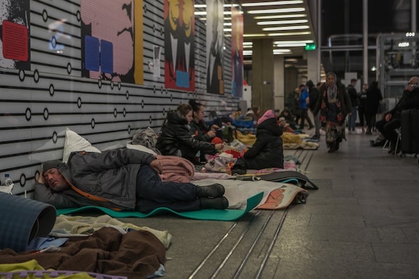 Volunteers have set up several tents offering food and clothes to Ukrainian refugees, many of them camped out on mats on the floor, at Warsaw’s central train station.Anna Liminowicz/The Globe and Mail