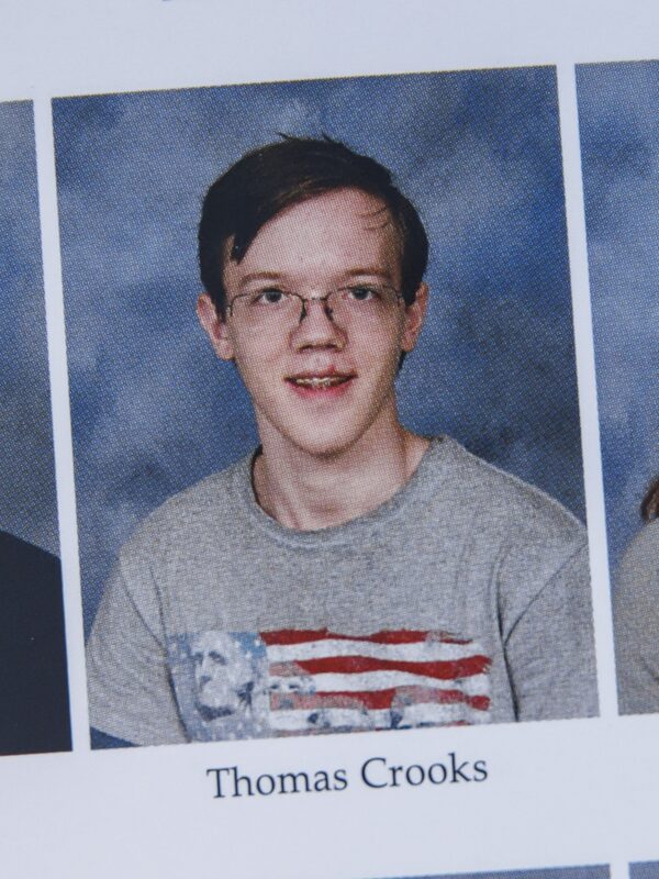A man identified as Thomas Crooks posed for his 2020 high-school yearbook photo in a T-shirt emblazoned with an image of the busts of the former presidents carved into Mount Rushmore.