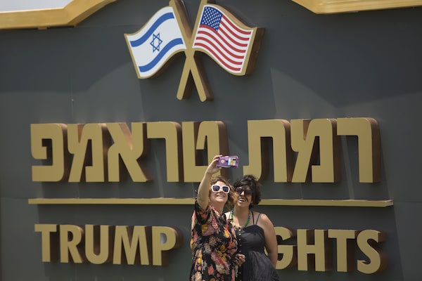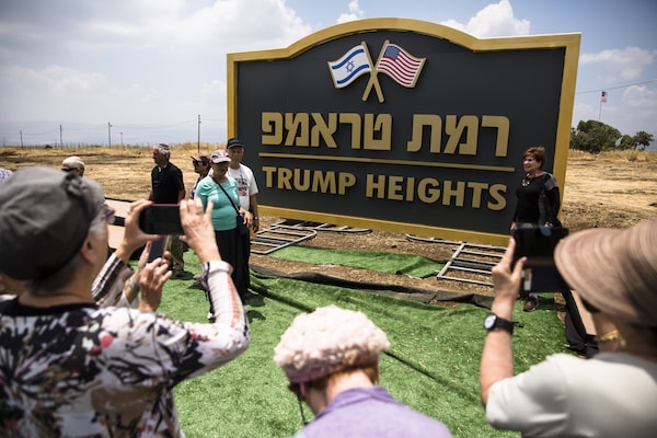Israelis take pictures of a sign at the future 'Trump Heights' settlement site in the Golan Heights in June of 2019. In a controversial move, President Donald Trump recognized Israel's claim on the region, which it annexed from Syria in the 1980s and is still seen internationally as Syrian territory.Amir Levy/Getty Images/Getty Images
