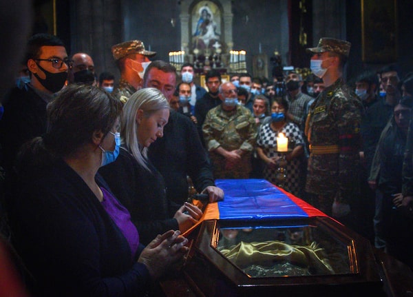 The two sides in the Nagorno-Karabakh dispute mourn their dead: At top, a funeral is held on Oct. 12 in Shamkir, Azerbaijan, for a couple killed in an attack on the town of Ganja, while at bottom, people attend an Oct. 9 service in Yerevan for an Armenian soldier.Umit Bektas/Reuters; KAREN MINASYAN/AFP via Getty Images/AFP/Getty Images