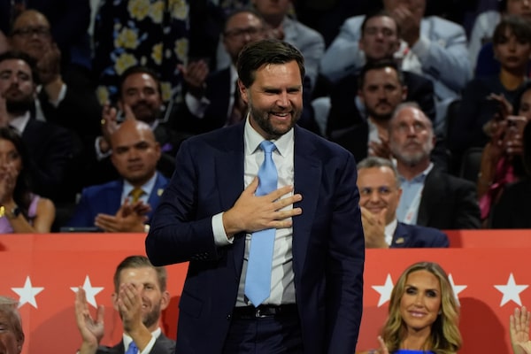 Republican vice presidential candidate JD Vance, reacts during the Republican National Convention Monday, July 15, 2024, in Milwaukee.Paul Sancya/The Associated Press
