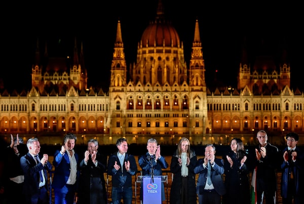 Peter Magyar and other officials celebrate in Budapest on Sunday.Marton Monus/Reuters