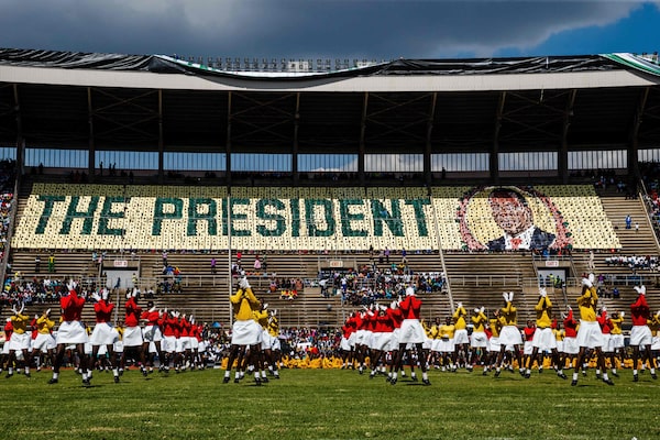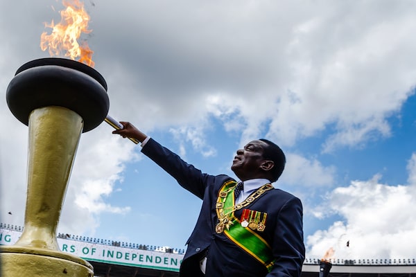 In Harare, President Emmerson Mnangagwa lights the Eternal Flame of Freedom at 2018's independence day celebrations, where spectators created a large co-ordinated portrait of him. These were his first independence day celebrations since coming to power the previous fall.JEKESAI NJIKIZANA/AFP/Getty Images