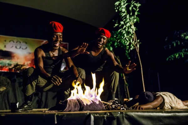 At top, government troops gather on a road west of Bulawayo in 1981 to stop ex-guerrillas loyal to Robert Mugabe's former ally, Joshua Nkomo, whose rival ZAPU party was the main target of the Gukurahundi operation; at bottom, actors in 2018 re-enact the atrocities of Gukurahundi in the play 1983: The Dark Years.The Associated Press; JEKESAI NJIKIZANA/AFP/Getty Images