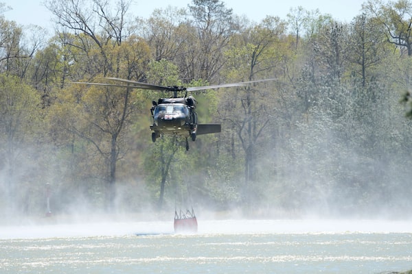 A helicopter drops a bucket to gather water to battle the Pauline Road wildfire on March 20 in Cleveland, Tex.David J. Phillip/The Associated Press