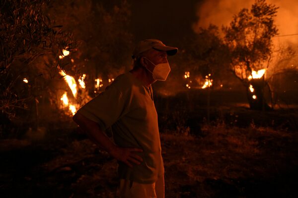 A man watches as a wildfire burns in the village of Vasilika, on Evia island, Greece, August 8, 2021.ALEXANDROS AVRAMIDIS/Reuters