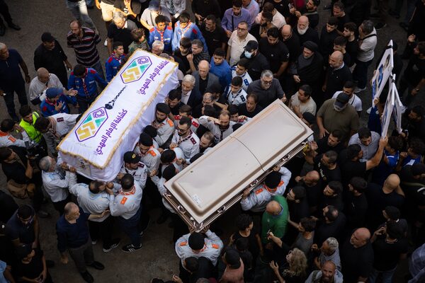The coffins of Amira and Hassan Fadlallah, aged 6 and 10, are carried through the streets of southern Beirut before their burial on July 31. They were killed in an Israeli strike on a residential building.