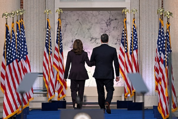 U.S. Vice President Democratic presidential candidate Kamala Harris and her husband Second Gentleman Doug Emhoff leave after she delivered her concession speech at Howard University in Washington, on Nov. 6.SAUL LOEB/AFP/Getty Images