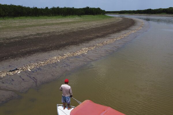 A fisherman stands on his boat as he navigates near thousands of dead fish awash on the banks of Piranha Lake due to a severe drought in the state of Amazonas, in Manacapuru, Brazil, on Sept. 27. The extreme drought sweeping across Brazil’s Amazon rainforest is already impacting hundreds of thousands of people and killing local wildlife.Edmar Barros/The Associated Press