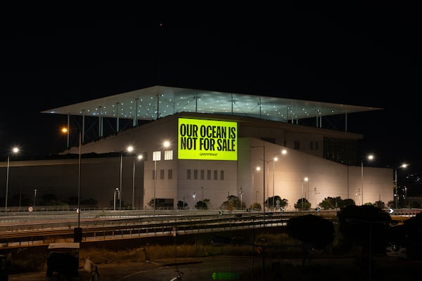 A message reading 'Our Ocean Is Not For Sale' projected by Greenpeace Greece activists onto the SNFCC conference centre in Kallithea, near Athens, on April 15.Supplied/Getty Images