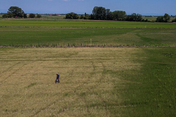Mauro Nuvolone, of agricultural company Fonio, walks in a dry paddy field in Sozzago, near Novara, northern Italy on July 11.PIERO CRUCIATTI/AFP/Getty Images