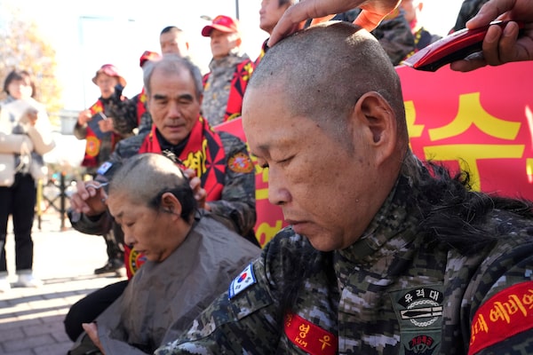Marine veterans get their heads shaved – a traditional Korean gesture of protest – at a Dec. 5 rally outside the presidential office in Seoul. Days earlier, President Yoon Suk Yeol declared martial law, which lawmakers quickly voted down amid a tense standoff with soldiers at the National Assembly.Ahn Young-joon/The Associated Press