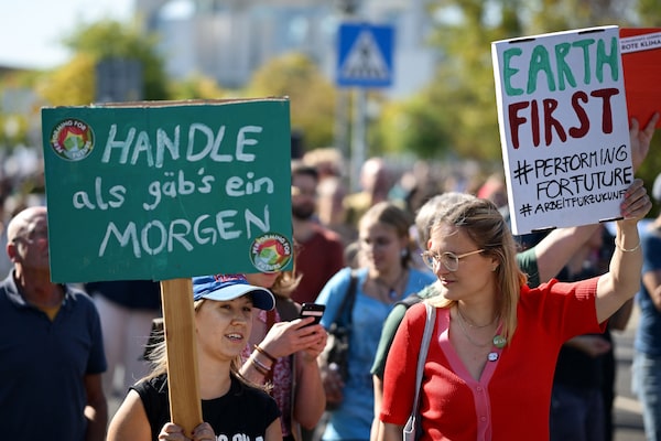 Participants hold up placards during a climate protest in front of the Chancellery, in Berlin, on Sept. 20.TOBIAS SCHWARZ/AFP/Getty Images