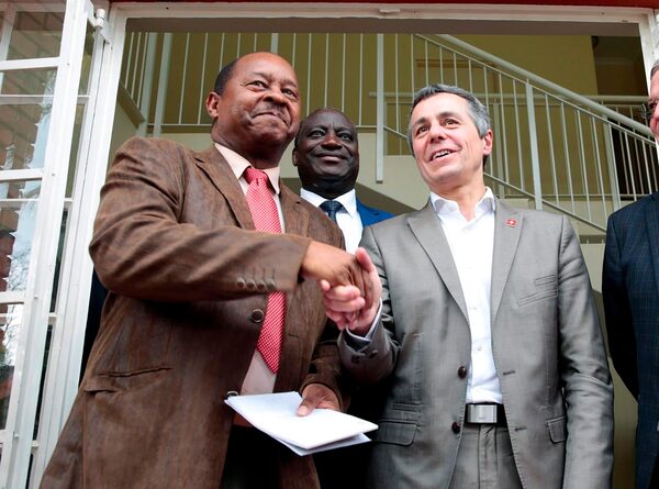 In this Jan. 9, 2019 file photo Federal Councilor Ignazio Cassis, right, of Switzerland, shakes hands with Zimbabwean Health Minister, Obadiah Moyo, left, in Harare.The Associated Press