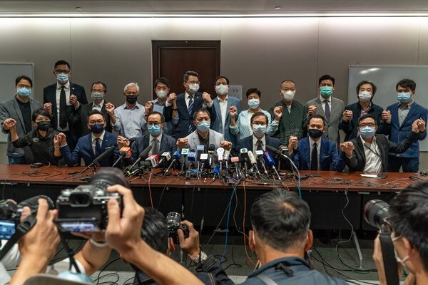 Pro-democracy lawmakers join hands during a press conference at the Legislative Council Building in Hong Kong, China.Anthony Kwan/Getty Images