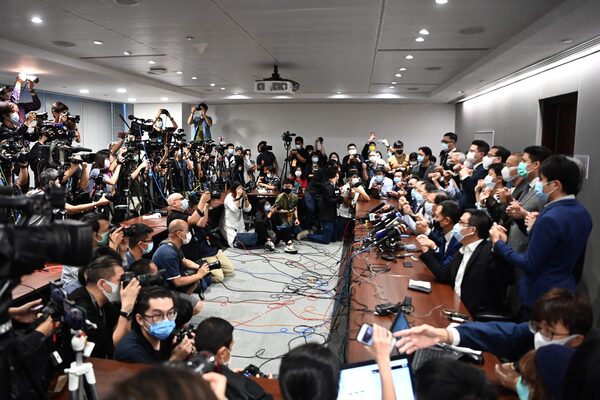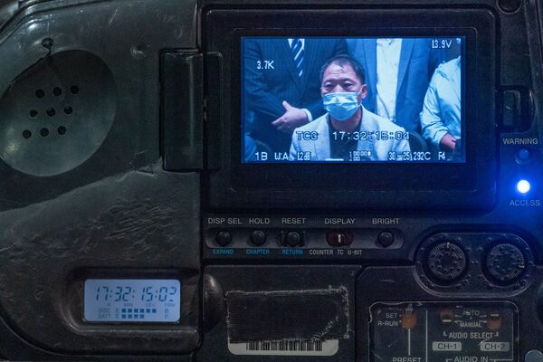 Pro-democracy lawmaker Wu Chi-wai is seen displayed on a screen of a camera recorder as he speaks to the members of media during a press conference at the Legislative Council Building in Hong Kong, China.Anthony Kwan/Getty Images