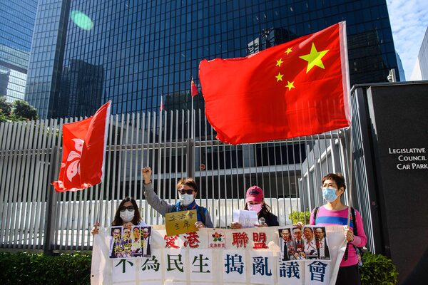 Pro-Beijing supporters gather outside the Legislative Council in Hong Kong.ANTHONY WALLACE/AFP/Getty Images