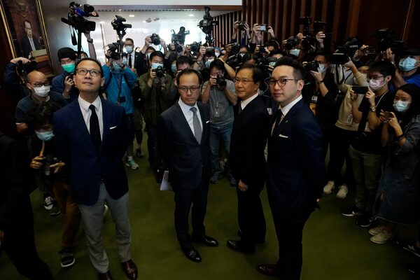 Four lawmakers, from left, Dennis Kwok, Kenneth Leung, Kwok Ka-ki and Alvin Yeung pose after a news conference at Legislative Council in Hong Kong, China.Vincent Yu/The Associated Press