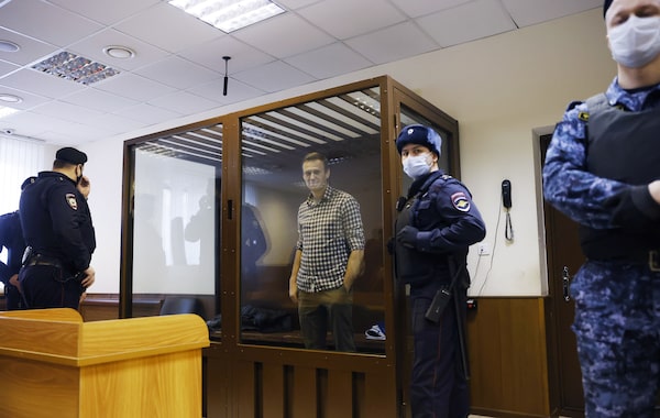 Alexey Navalny appears via a video link from the Arctic penal colony where he is serving a 19-year sentence on Jan. 11, 2024.Alexander Zemlianichenko/The Associated Press