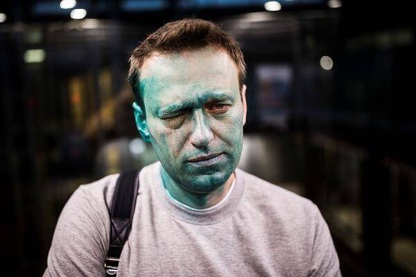Photo taken on April 27, 2017 of Russian opposition leader Alexey Navalny after unknown attackers doused him with green antiseptic outside a conference venue in Moscow, Russia.The Associated Press
