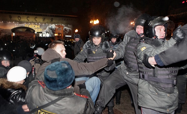 Police detain protest leader Alexey Navalny, seen wearing hooded jacket, after a rally in Pushkin Square in Moscow on March 5, 2012.Maria Turchenkova/The Associated Press