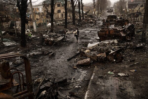 A woman walks amid destroyed Russian tanks in Bucha, on the outskirts of Kyiv on April 3, 2022.Rodrigo Abd/The Associated Press