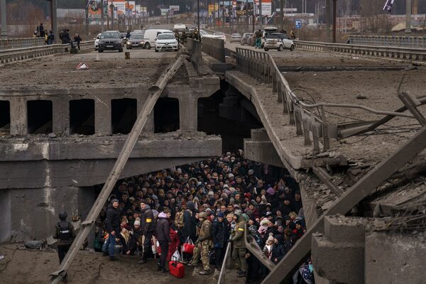Ukrainians crowd under a destroyed bridge as they try to flee by crossing the Irpin River on the outskirts of Kyiv on March 5, 2022.Emilio Morenatti/The Associated Press