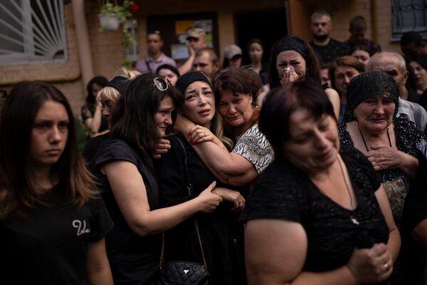 Anastasia Ohrimenko is comforted by relatives and friends as she cries next to a coffin with the body of her husband Yury Styglyuk, a Ukrainian serviceman who died in combat on Aug. 24 in Maryinka, Donetsk, during his funeral in Bucha, Ukraine, Aug. 31, 2022.Emilio Morenatti/The Associated Press