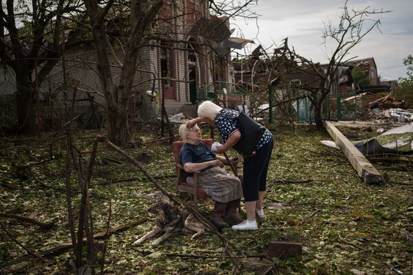 Elena Holovko sits among debris while being helped outside her house that was damaged after a missile strike in Druzhkivka, eastern Ukraine on June 5, 2022.Bernat Armangue/The Associated Press