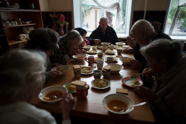 Patients eat a meal in a shelter for injured and homeless people in Izium, Ukraine on Sept. 26, 2022.Evgeniy Maloletka/The Associated Press