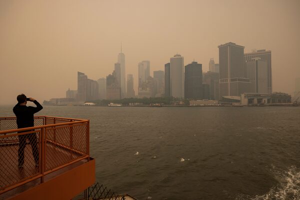 New York City is visible in a haze-filled sky due to wildfires in Canada, photographed from the Staten Island Ferry, on June 7, 2023.Yuki Iwamura/The Associated Press