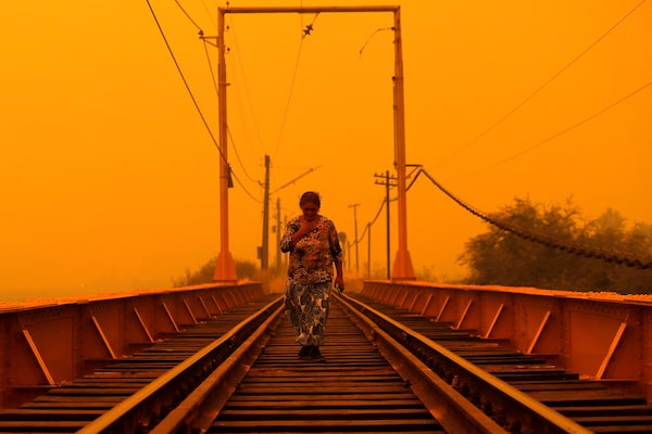A woman walks on a bridge during the fires in Renaico, Araucania region, Chile on February 4, 2023.JAVIER TORRES/Getty Images