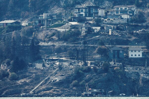 Destroyed houses are seen from across Lake Okanagan almost a week after the McDougall Creek burned through the community of West Kelowna B.C. on August 24, 2023.JESSE WINTER/Reuters