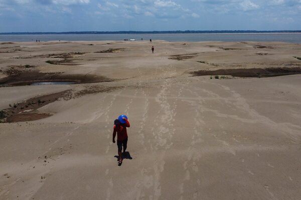 Residents of a riverside community carry food and containers of drinking water from an aid distribution due to the ongoing drought in Careiro da Varzea, Amazonas state, Brazil, Oct. 24, 2023.Edmar Barros/The Associated Press